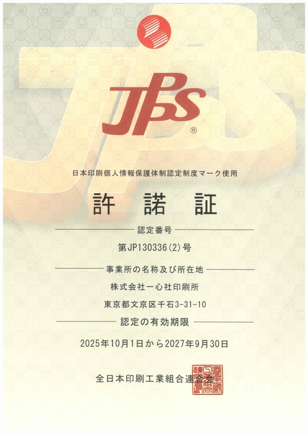 ※2025年10月、「日本印刷個人情報保護体制認定制度」(JPPS)の認証を更新いたしました。